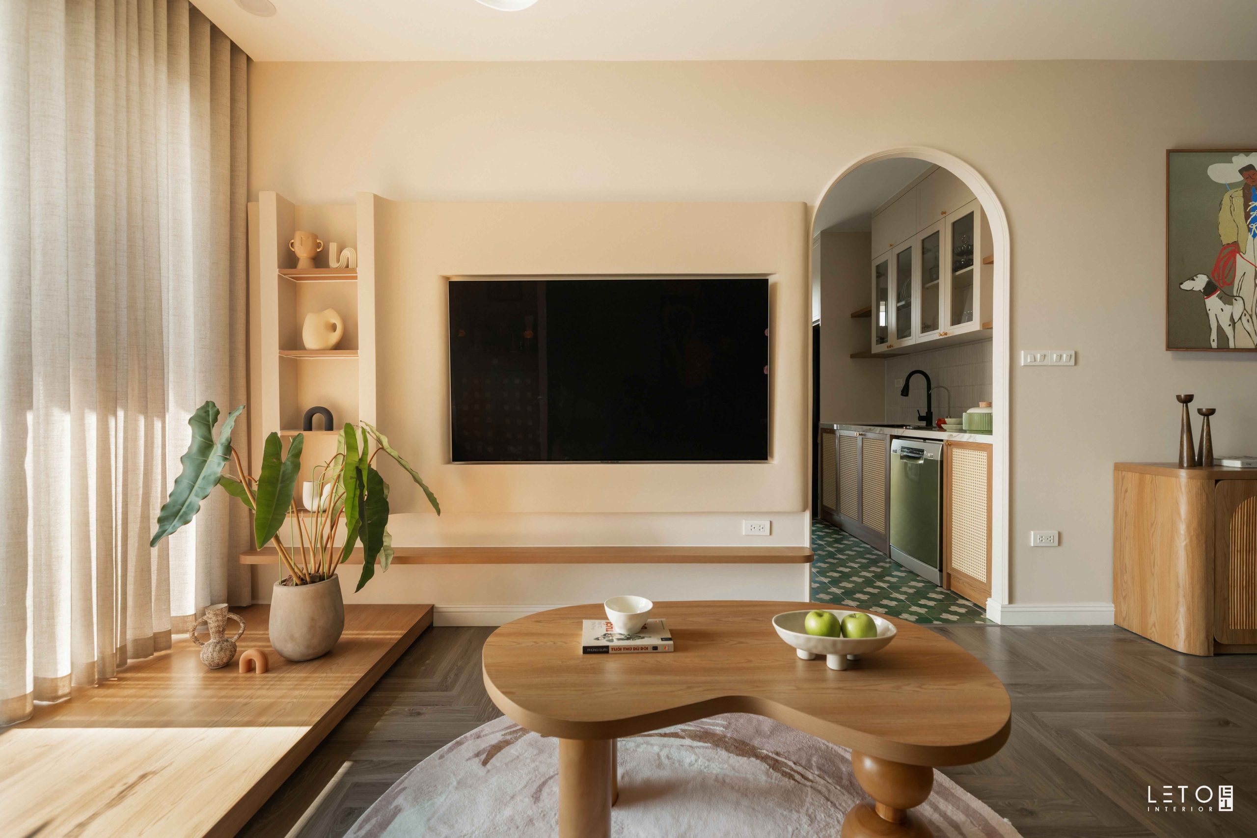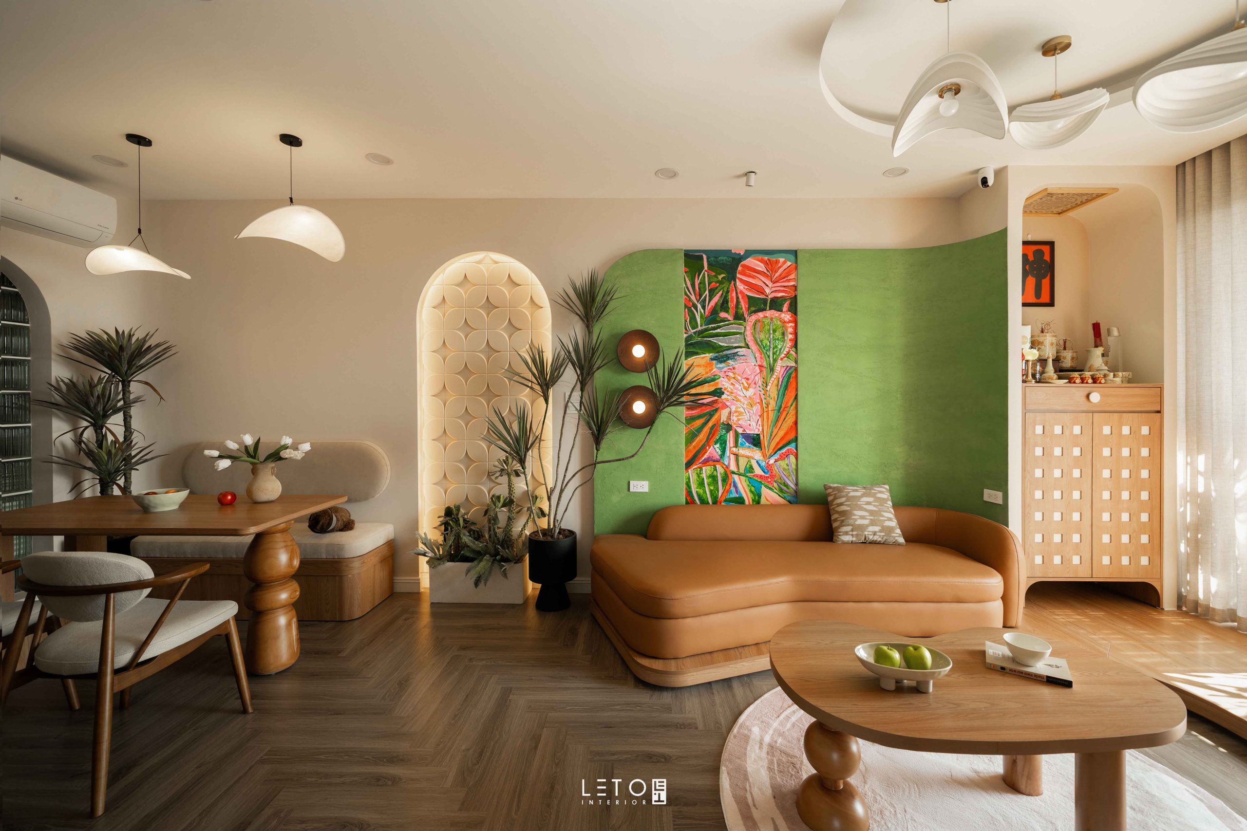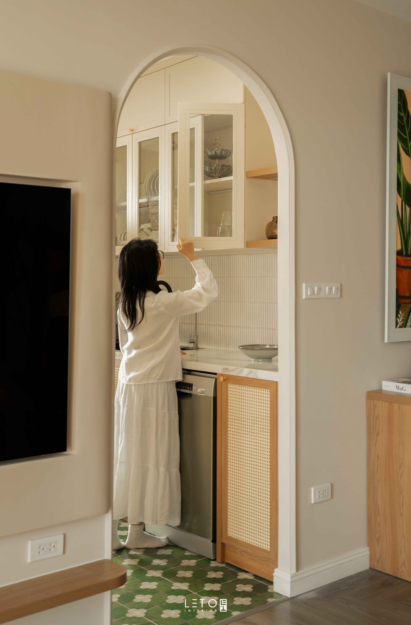 Sau cùng là Faded Moss, viên đá trang trí được đặt vào đúng vị trí để hoàn thiện tổng thể. Xuất hiện ở vách sau sofa và gạch ốp sàn bếp, sắc xanh này không đơn thuần được tạo nên từ xanh lá, vàng và ghi như thường thấy. Trong quá trình pha màu, chúng tôi chủ ý thêm vào một lượng cam rất nhỏ. Chính chi tiết này khiến Faded Moss có độ chín và chiều sâu nghệ thuật.