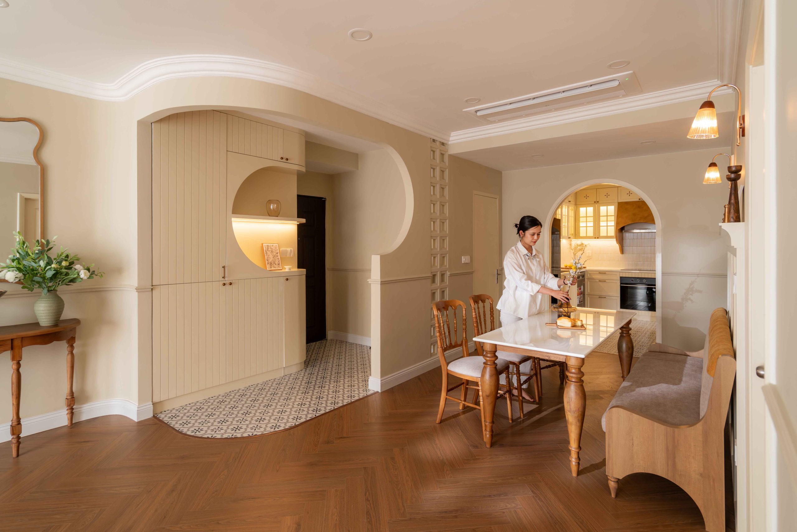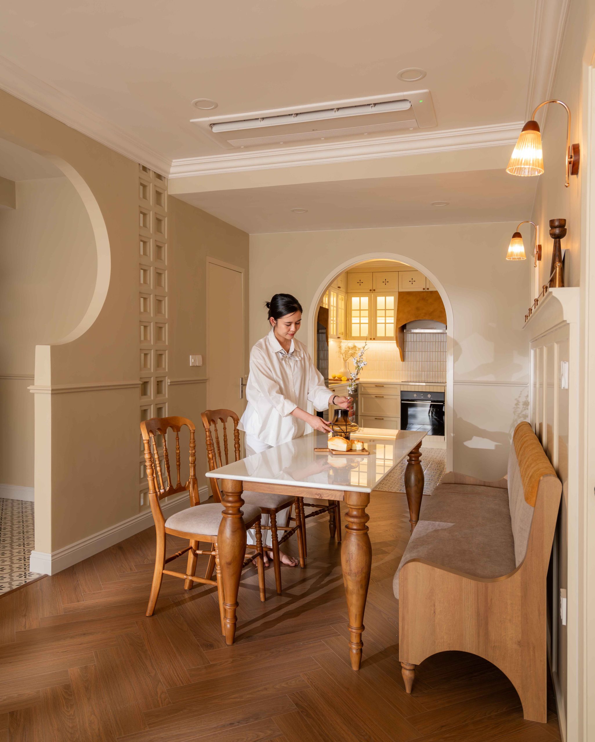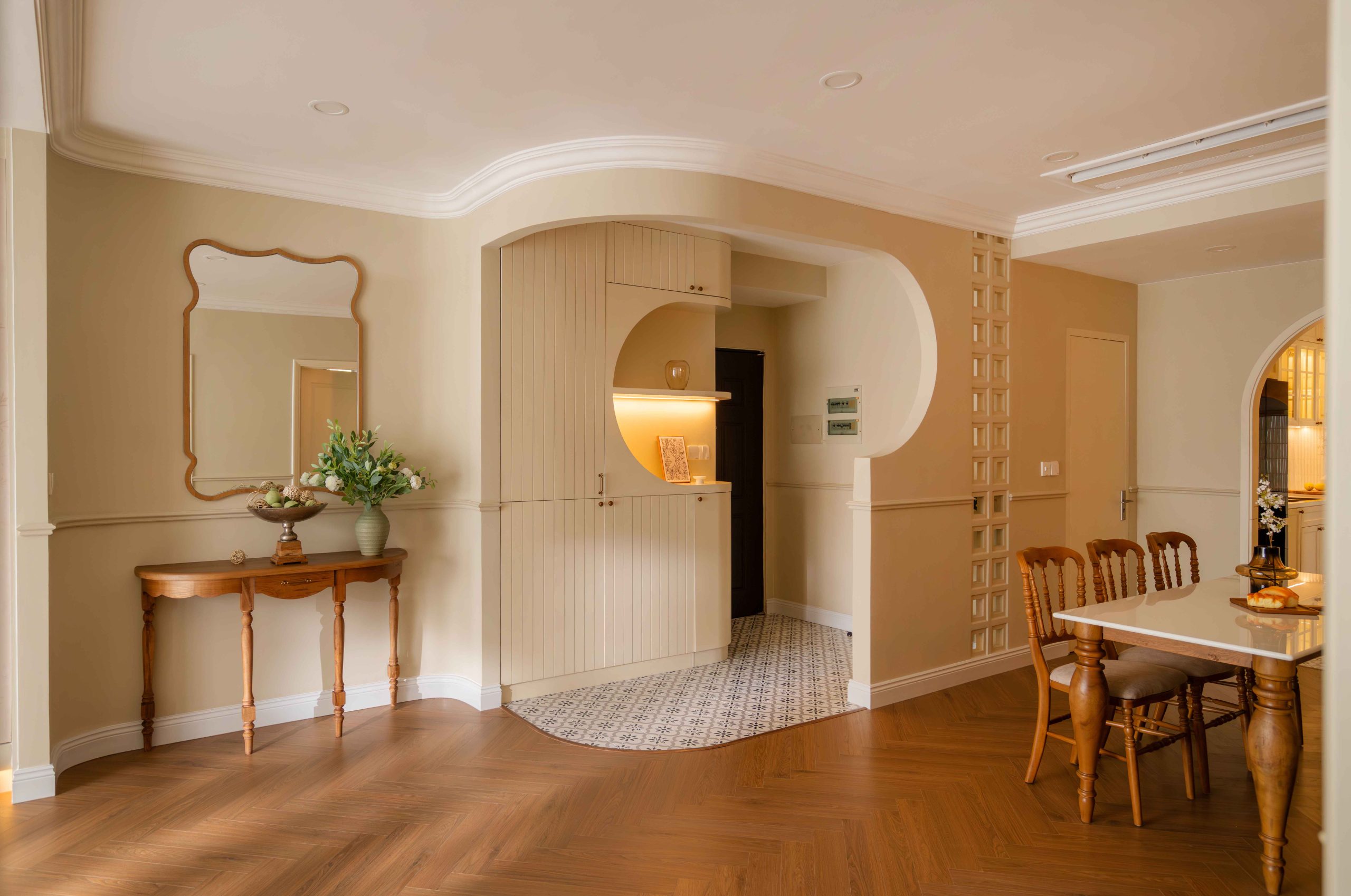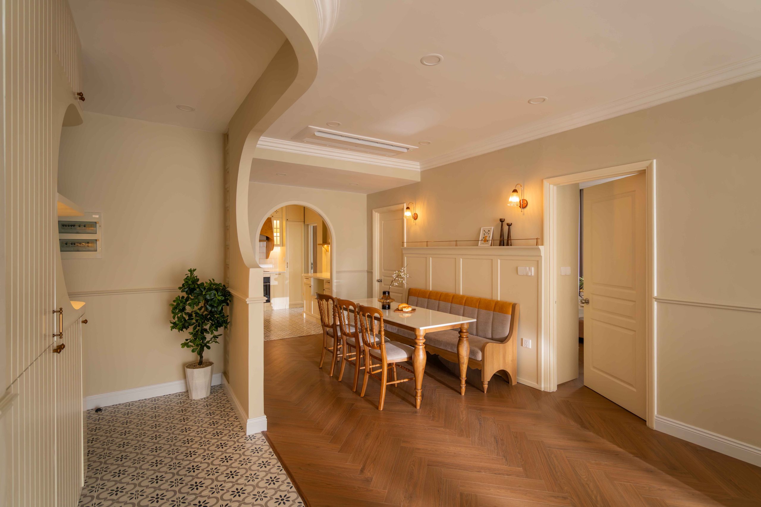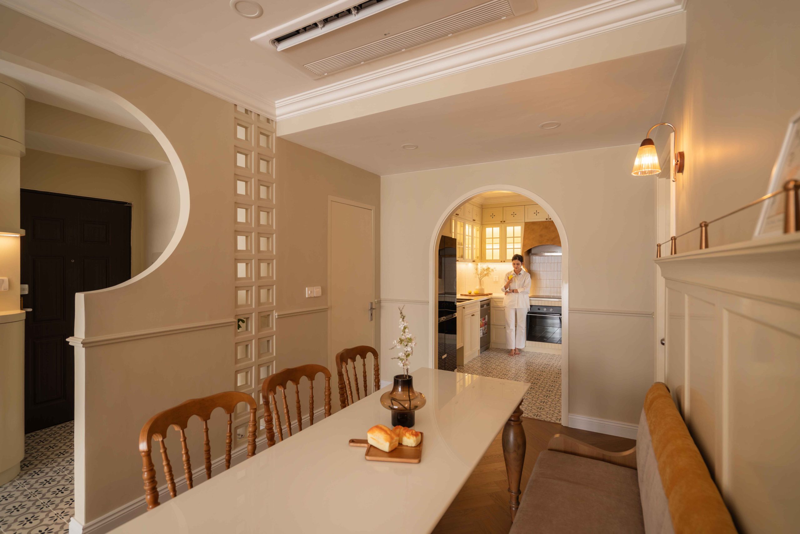 Căn hộ 120m² tại Chung cư Mỹ Đức Q7, TP.HCM, được thiết kế theo tinh thần Elegant x Farmhouse, là một thử nghiệm cho chính câu hỏi đó. Không tìm cách tái hiện lại bất kỳ ký ức cụ thể nào, không vay mượn một hình ảnh hoài niệm rõ rệt, không gian này lựa chọn một cách tiếp cận khác: tạo ra cảm giác quen thuộc bằng những sắc độ tưởng chừng đã luôn tồn tại trong trí nhớ của mỗi người.