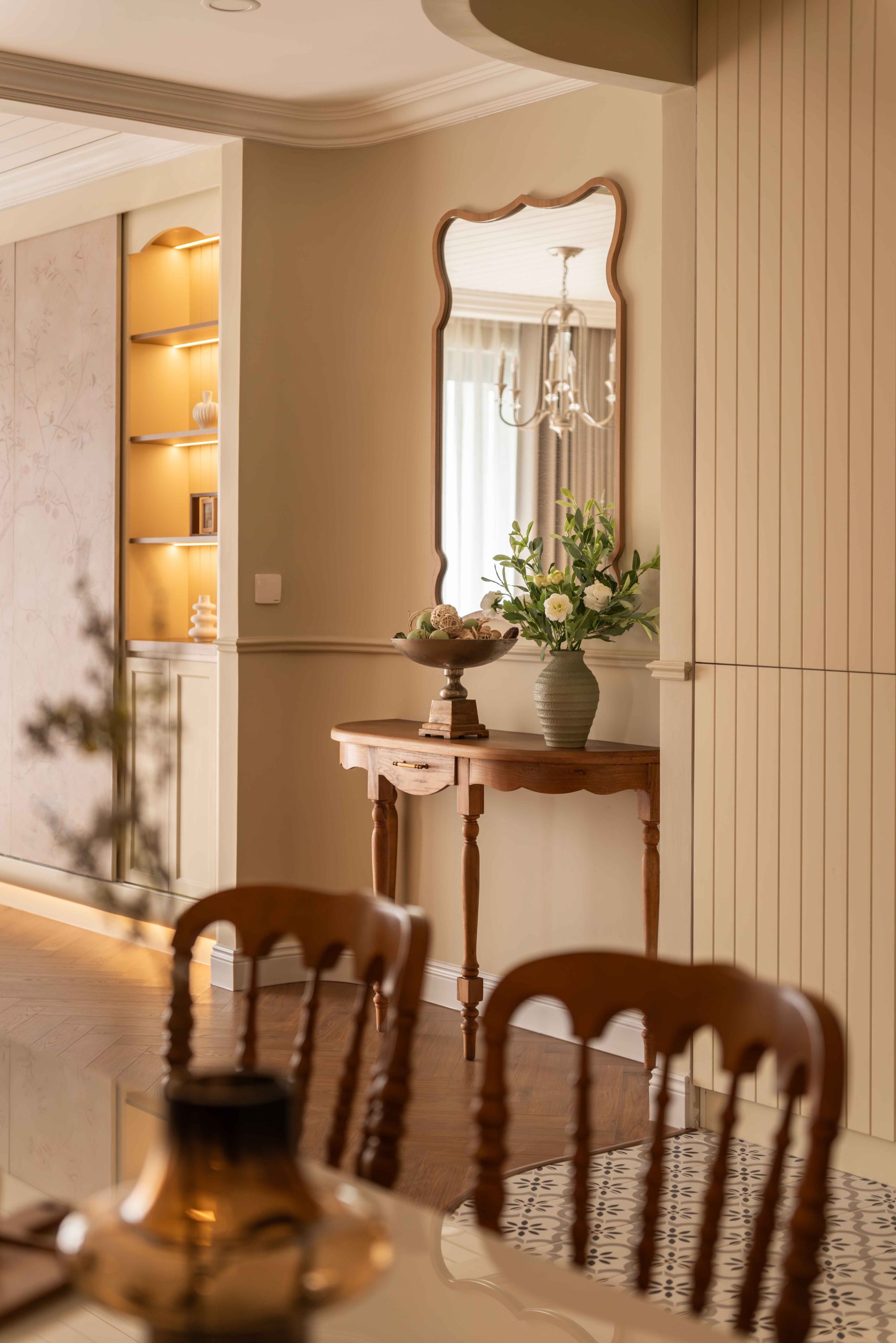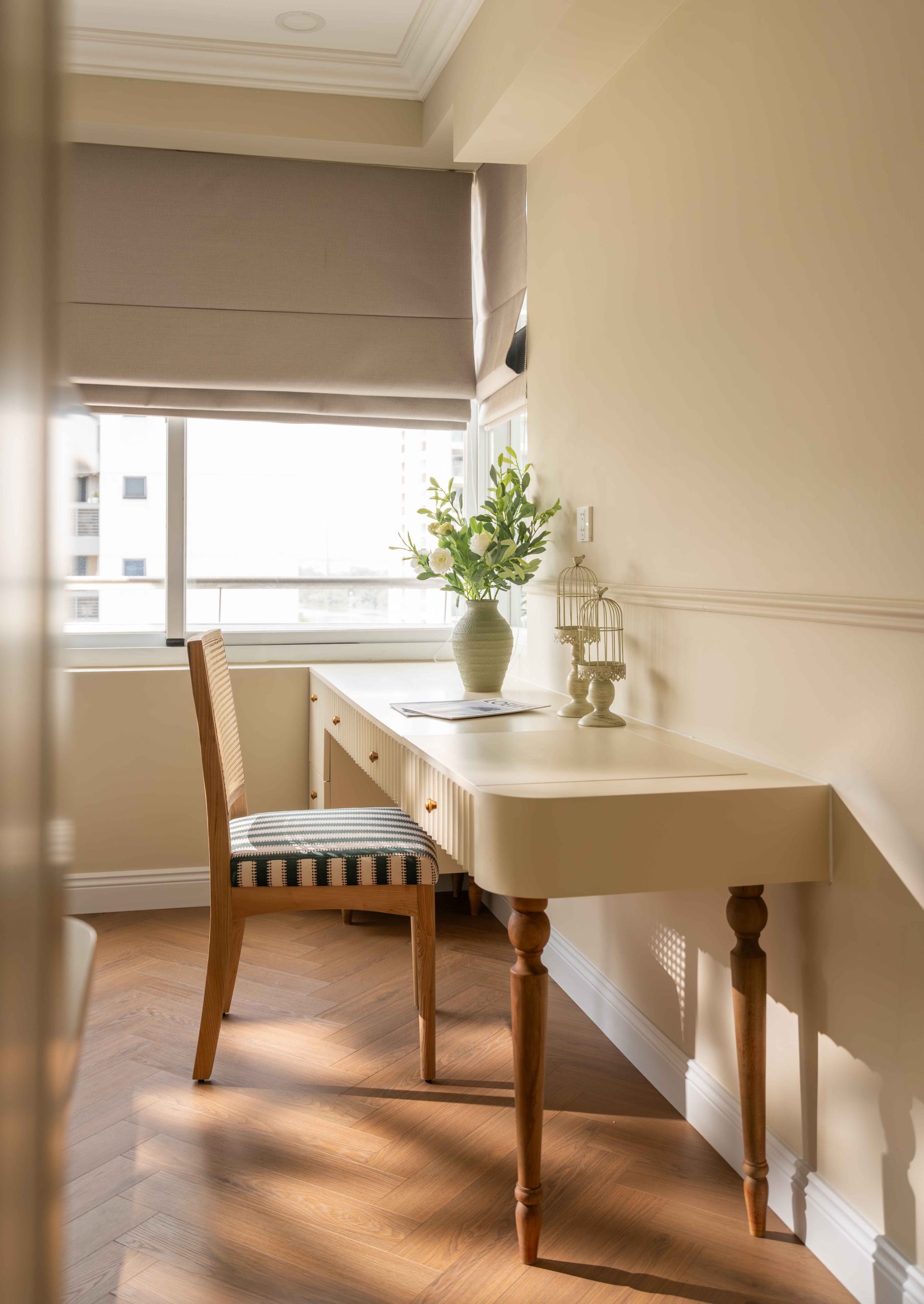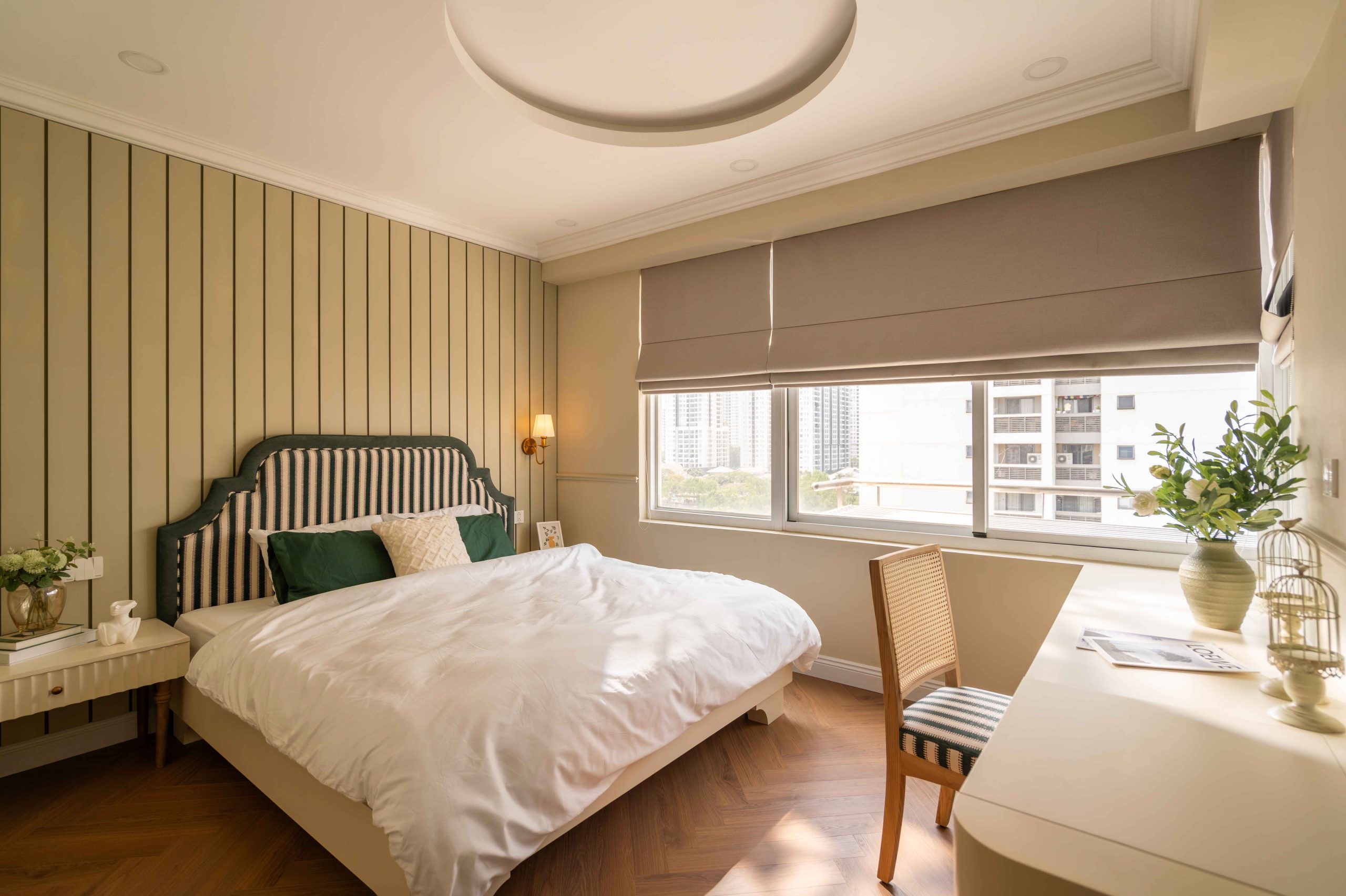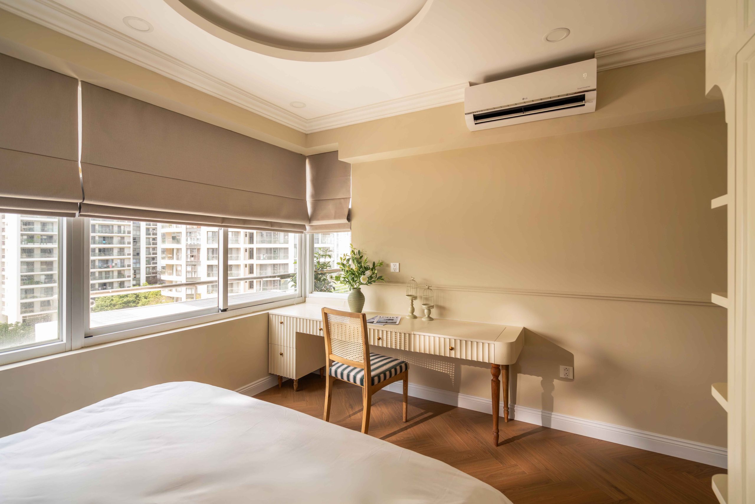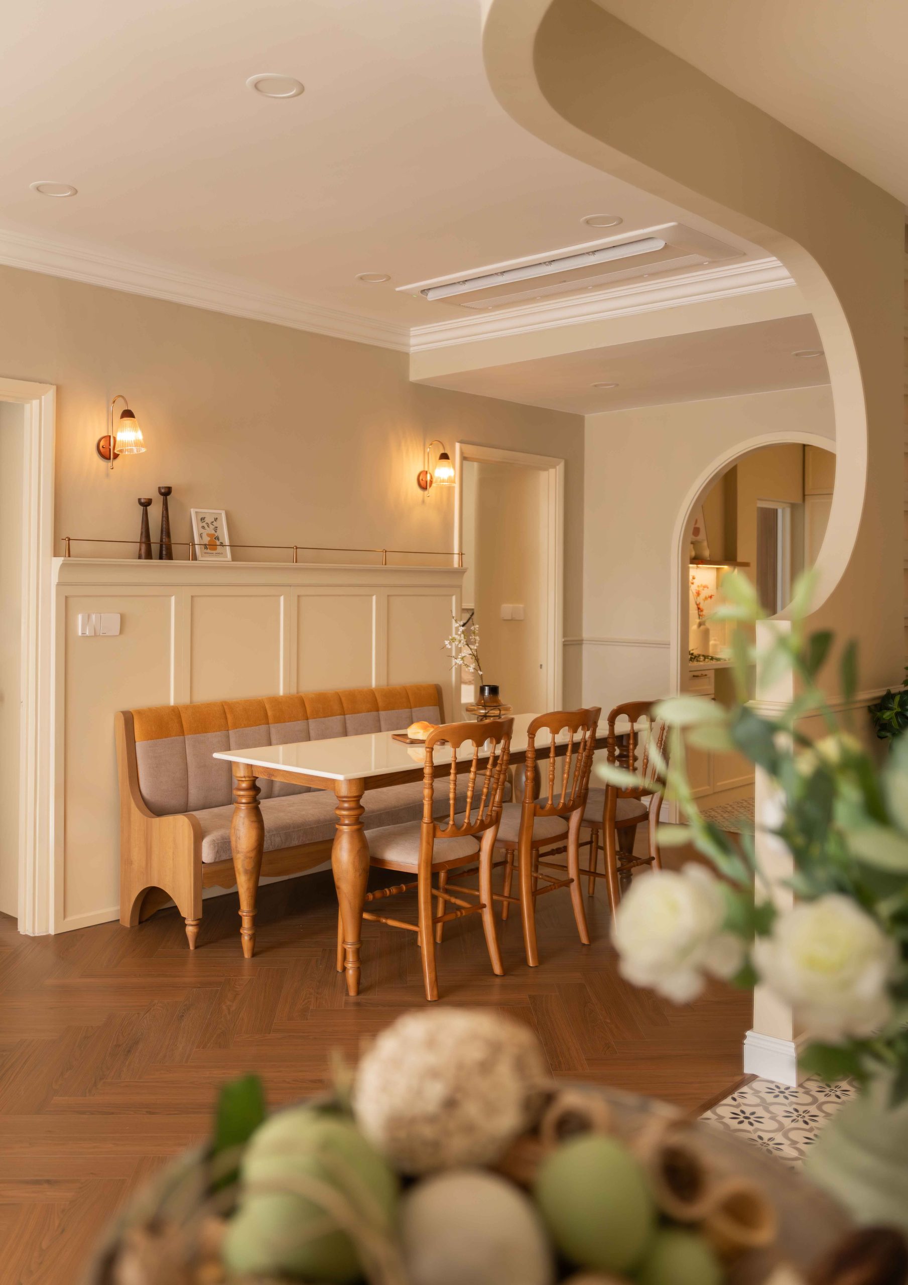 Căn hộ 120m² tại Chung cư Mỹ Đức Q7, TP.HCM, được thiết kế theo tinh thần Elegant x Farmhouse, là một thử nghiệm cho chính câu hỏi đó. Không tìm cách tái hiện lại bất kỳ ký ức cụ thể nào, không vay mượn một hình ảnh hoài niệm rõ rệt, không gian này lựa chọn một cách tiếp cận khác: tạo ra cảm giác quen thuộc bằng những sắc độ tưởng chừng đã luôn tồn tại trong trí nhớ của mỗi người.