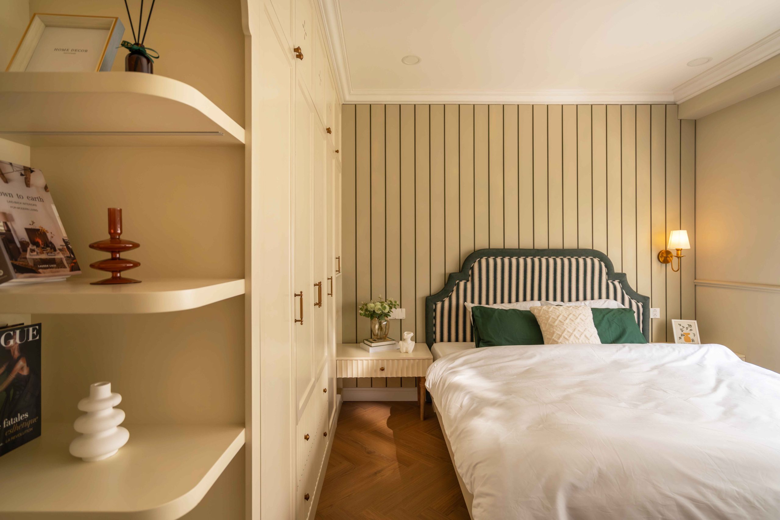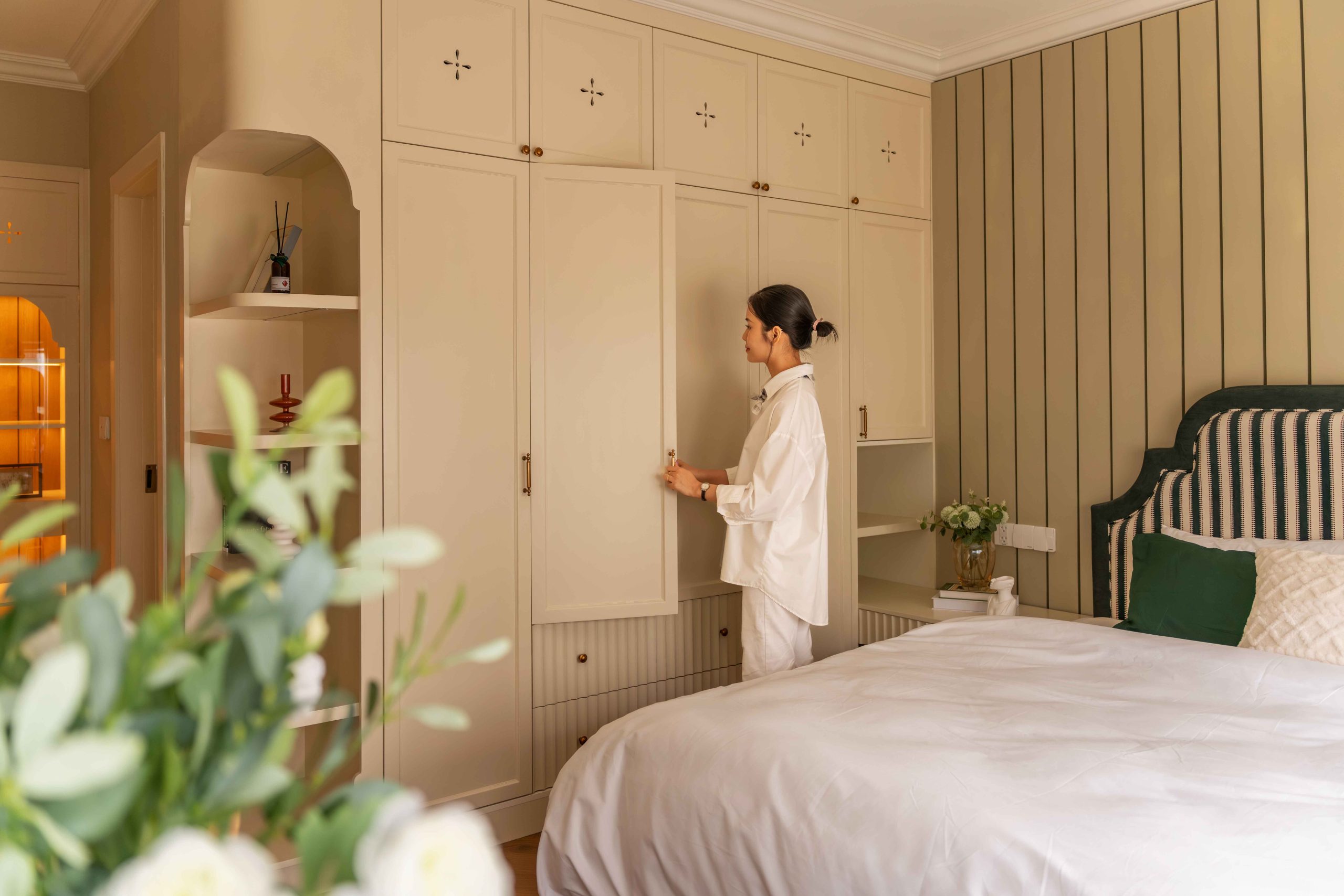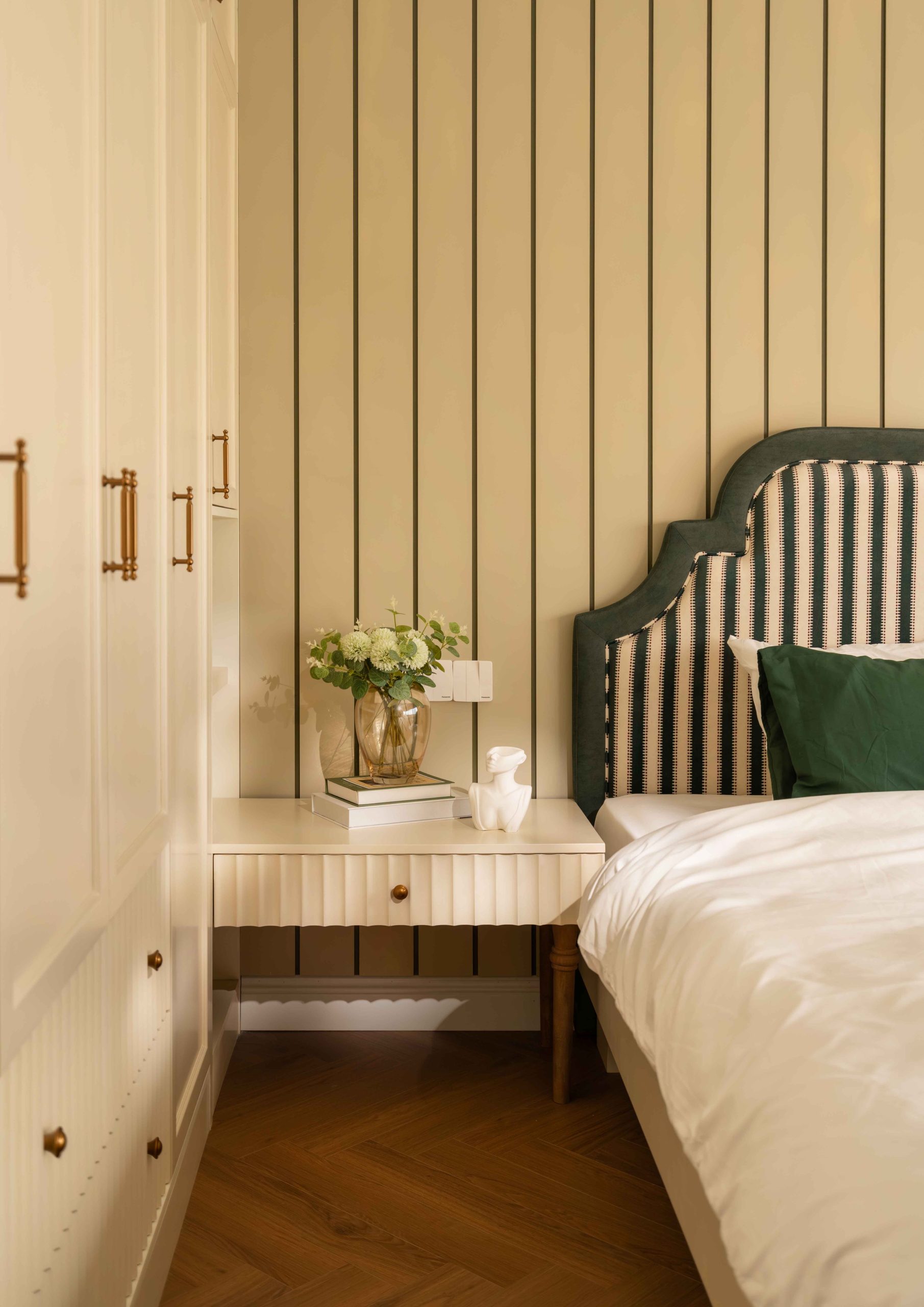 Velvet Moss, sắc xanh bí ẩn được tạo nên từ xanh lá, vàng và một lượng ghi rất nhỏ. Xuất hiện tiết chế ở đầu giường và một vài chi tiết nhỏ, Moss Green không giữ vai trò dẫn dắt, nhưng lại là yếu tố khiến toàn bộ bảng màu trở nên trọn vẹn. Sắc xanh này không phải thứ đầu tiên ta nhớ đến, nhưng lại là thứ khiến toàn bộ trải nghiệm trở nên hoàn chỉnh.