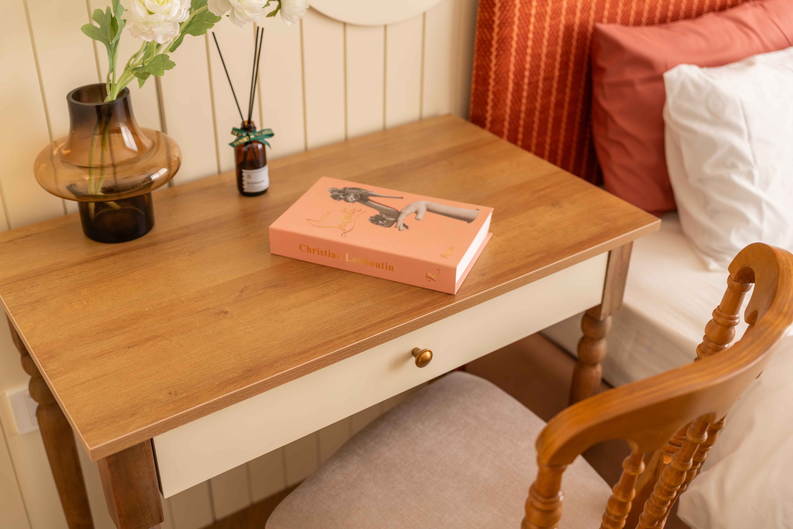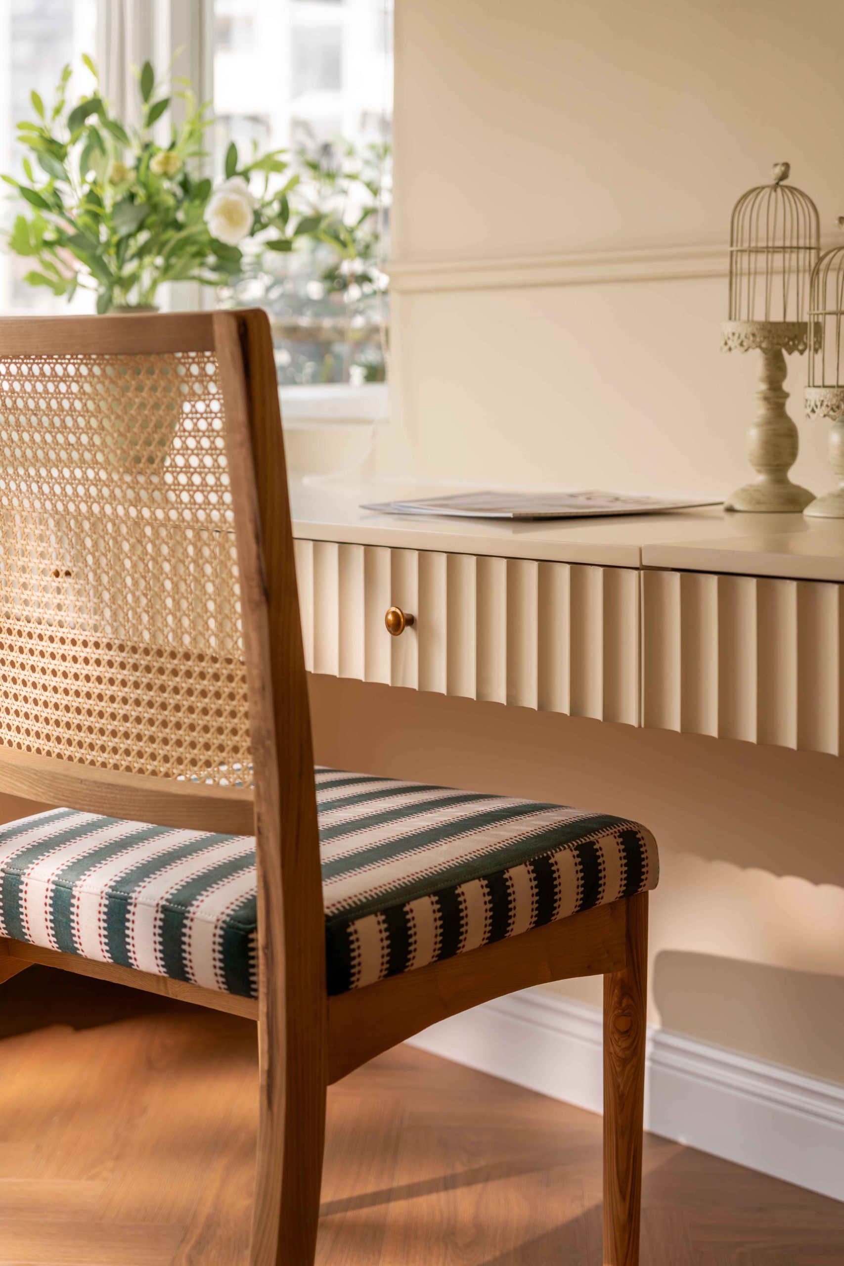 Xen giữa những mảng màu sắc, các chi tiết sọc kẻ xuất hiện đầy bất ngờ trên bề mặt nội thất và vật liệu. Chính những đường kẻ nhỏ này khiến không gian trở nên gần gũi hơn theo một cách khó gọi tên, như thể sự đặc biệt không nằm ở việc khác biệt, mà ở cách nó chạm nhẹ vào ký ức theo một nhịp rất “ngọt”.
