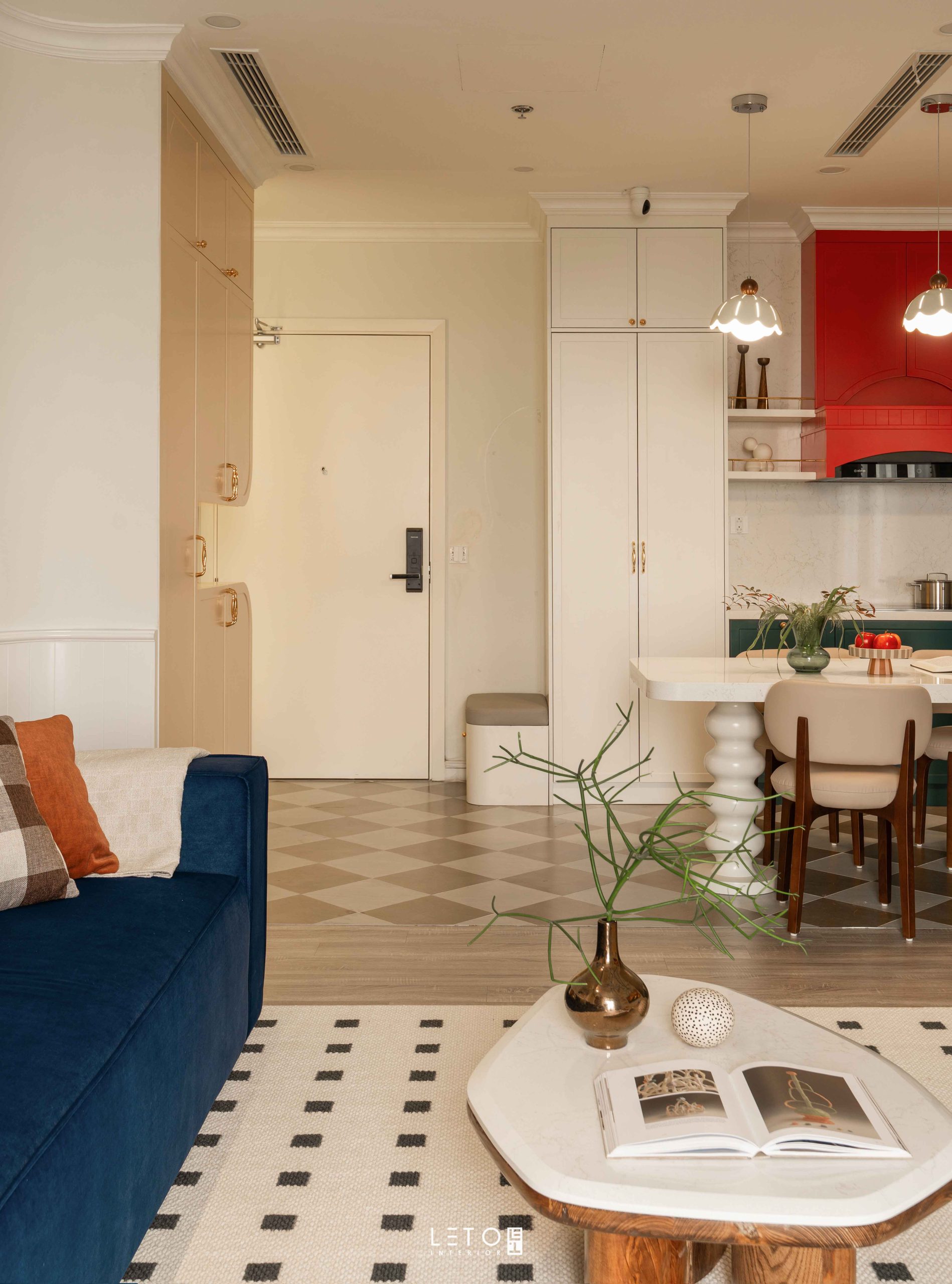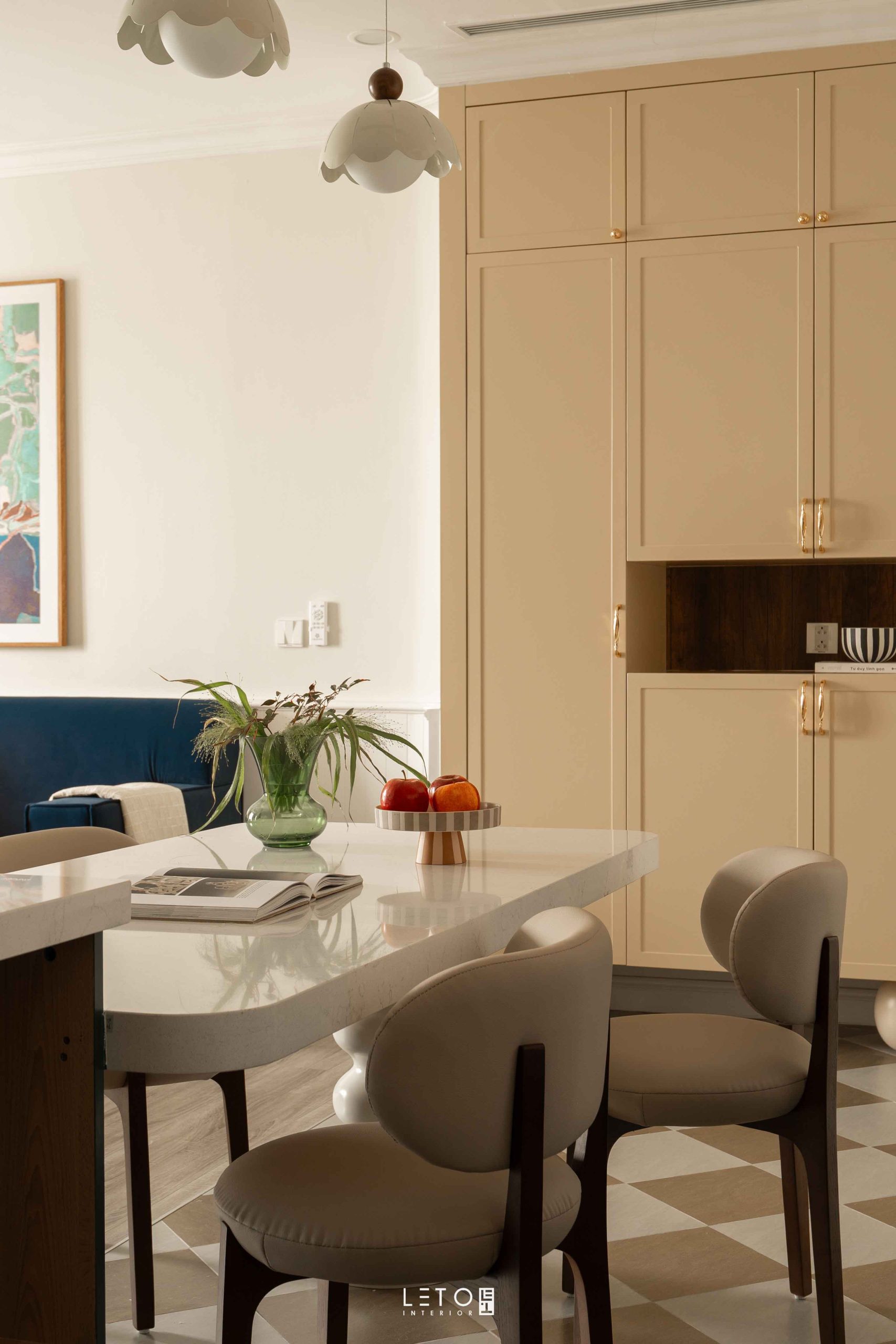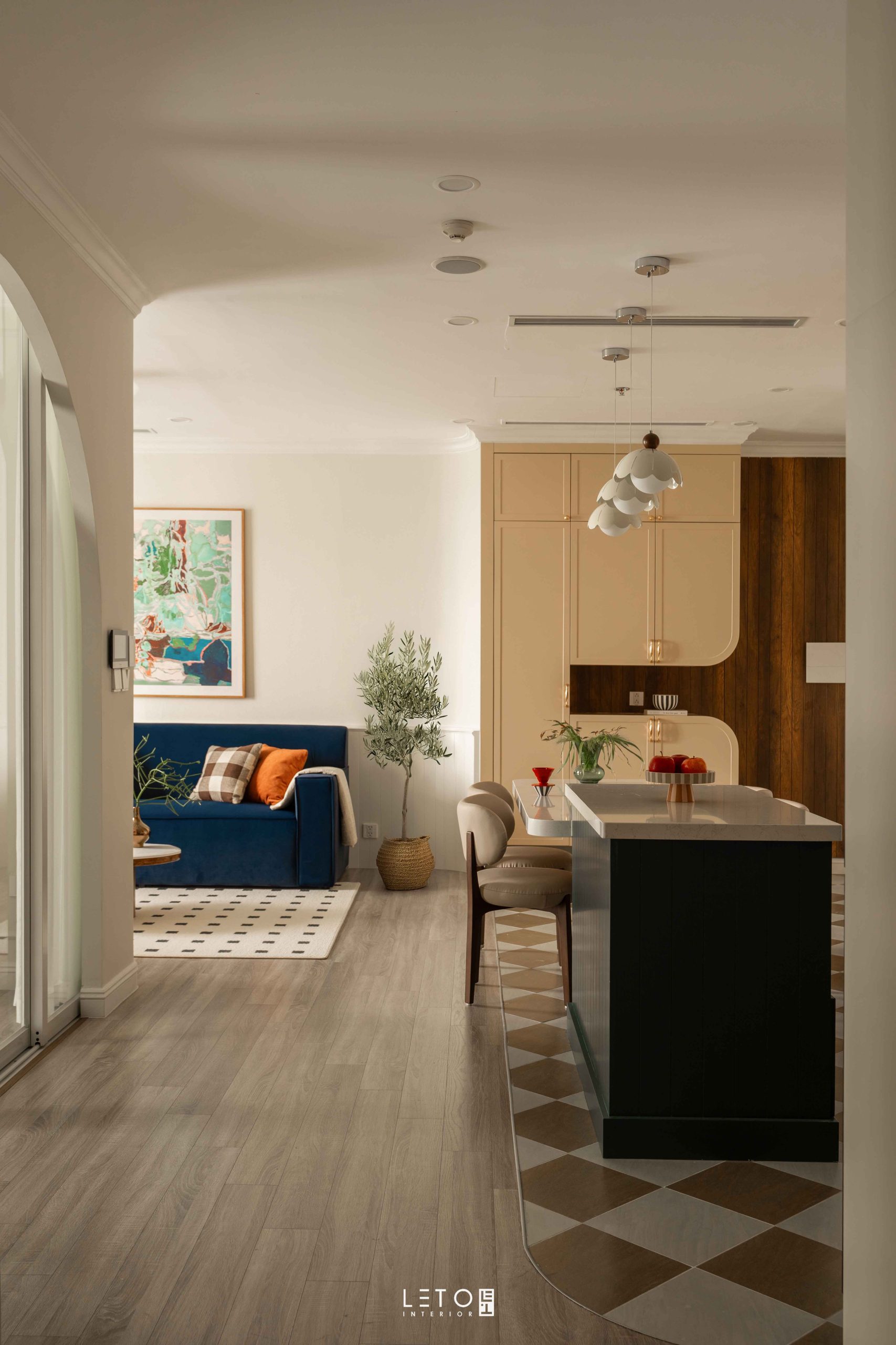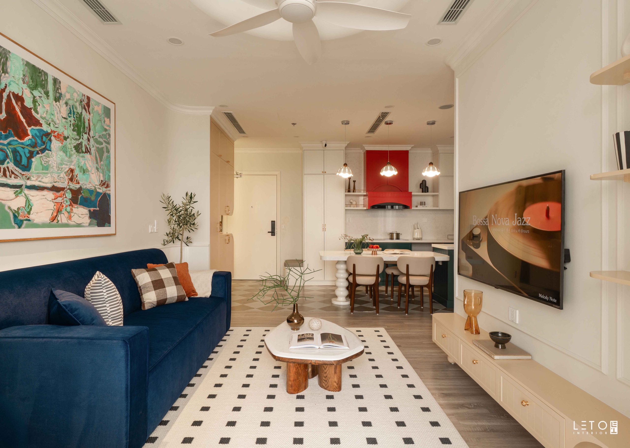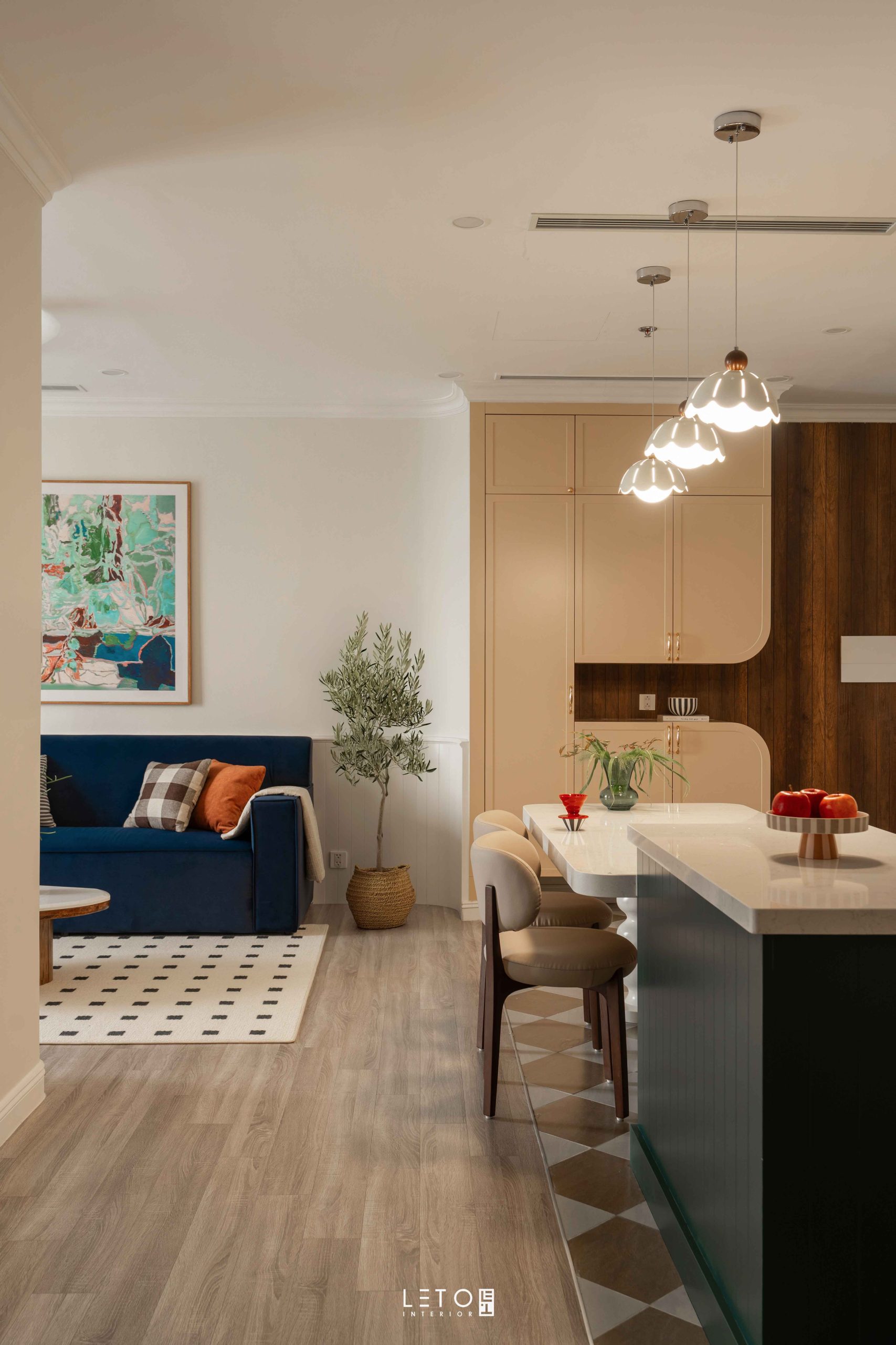 Căn hộ 110m² tại Sky Forest (Ecopark), mang tinh thần Art Deco là một trong những không gian sống thể hiện rất rõ vai trò của “màu phối”.