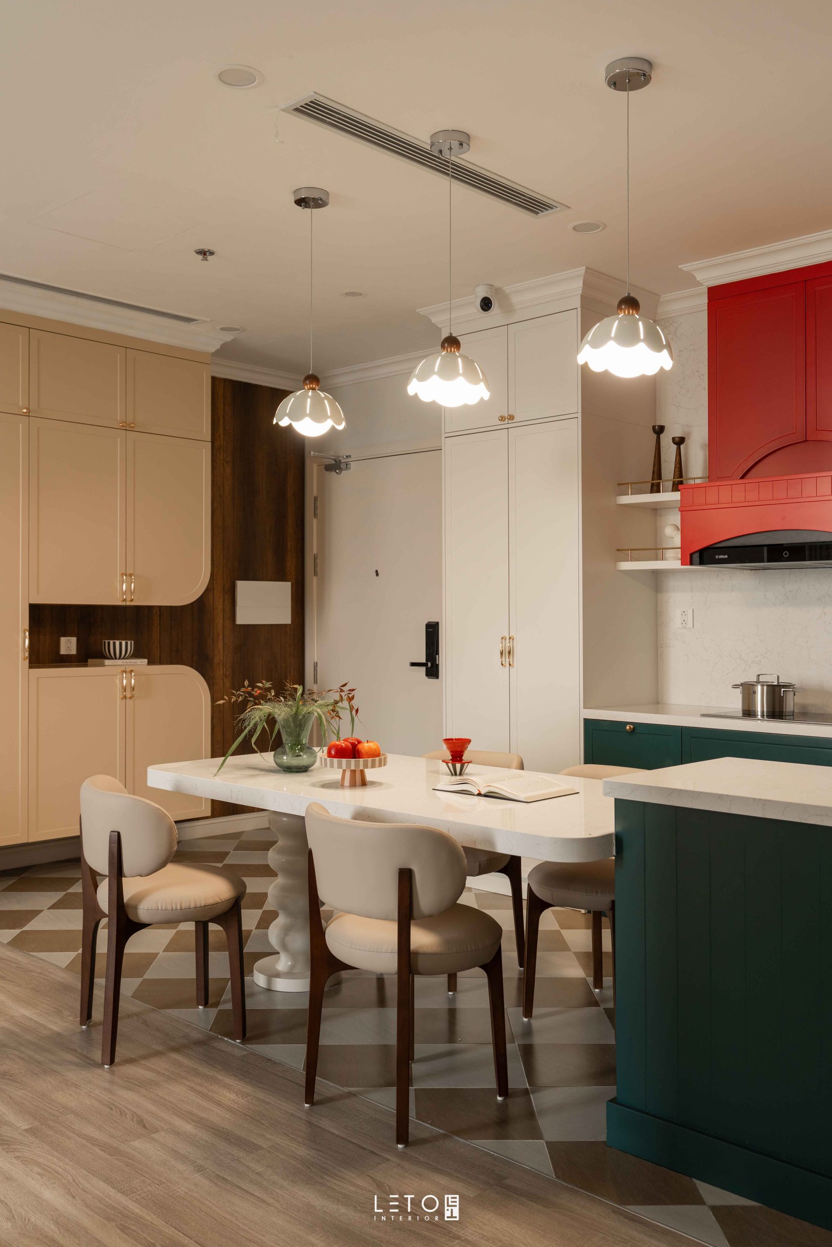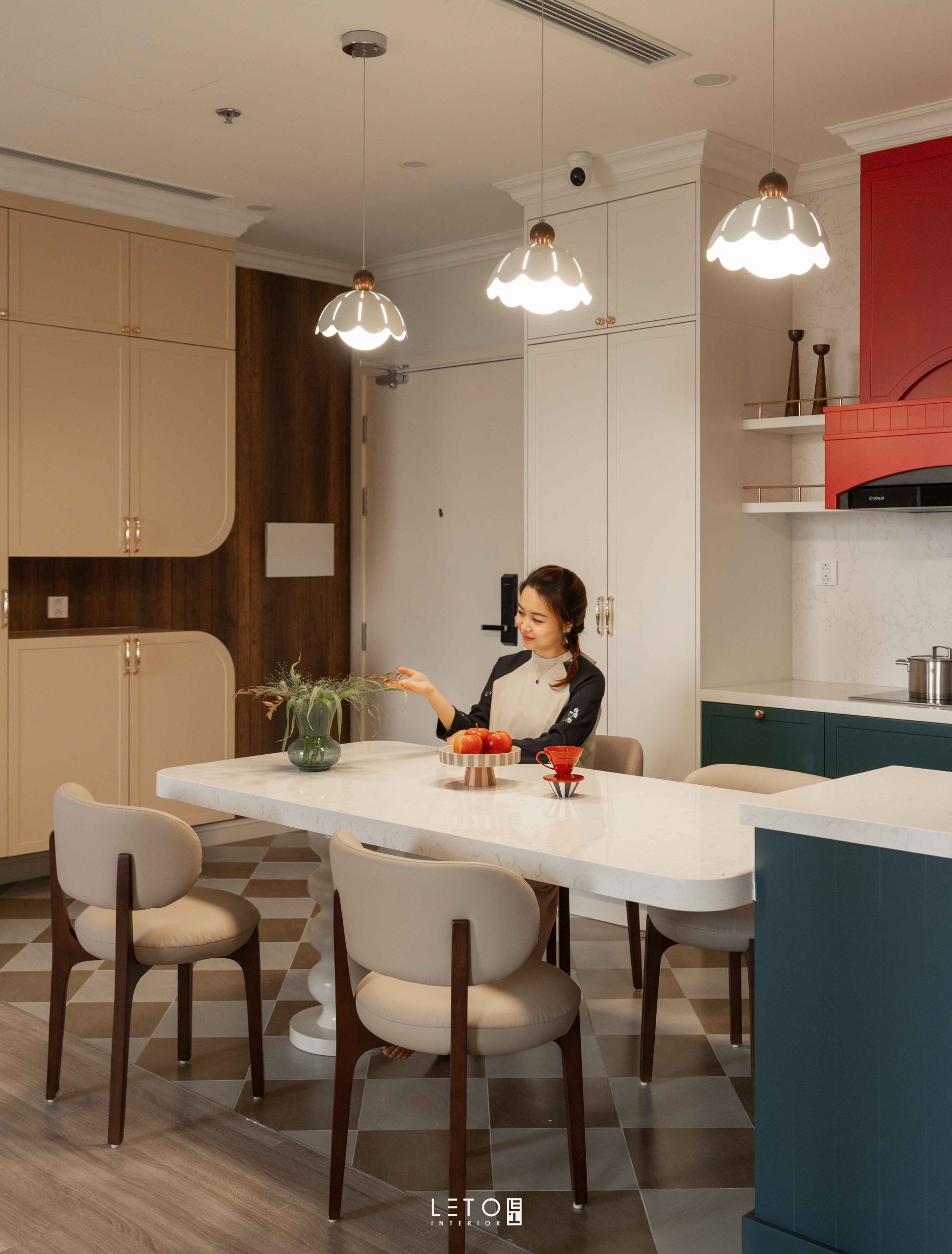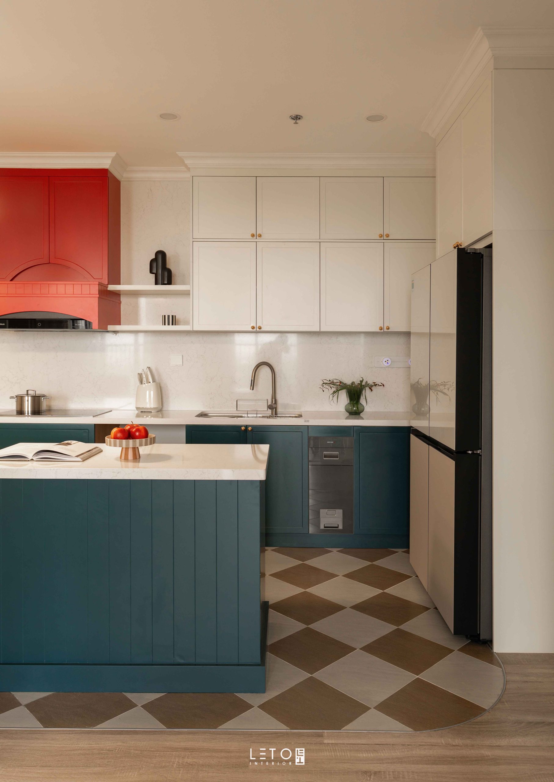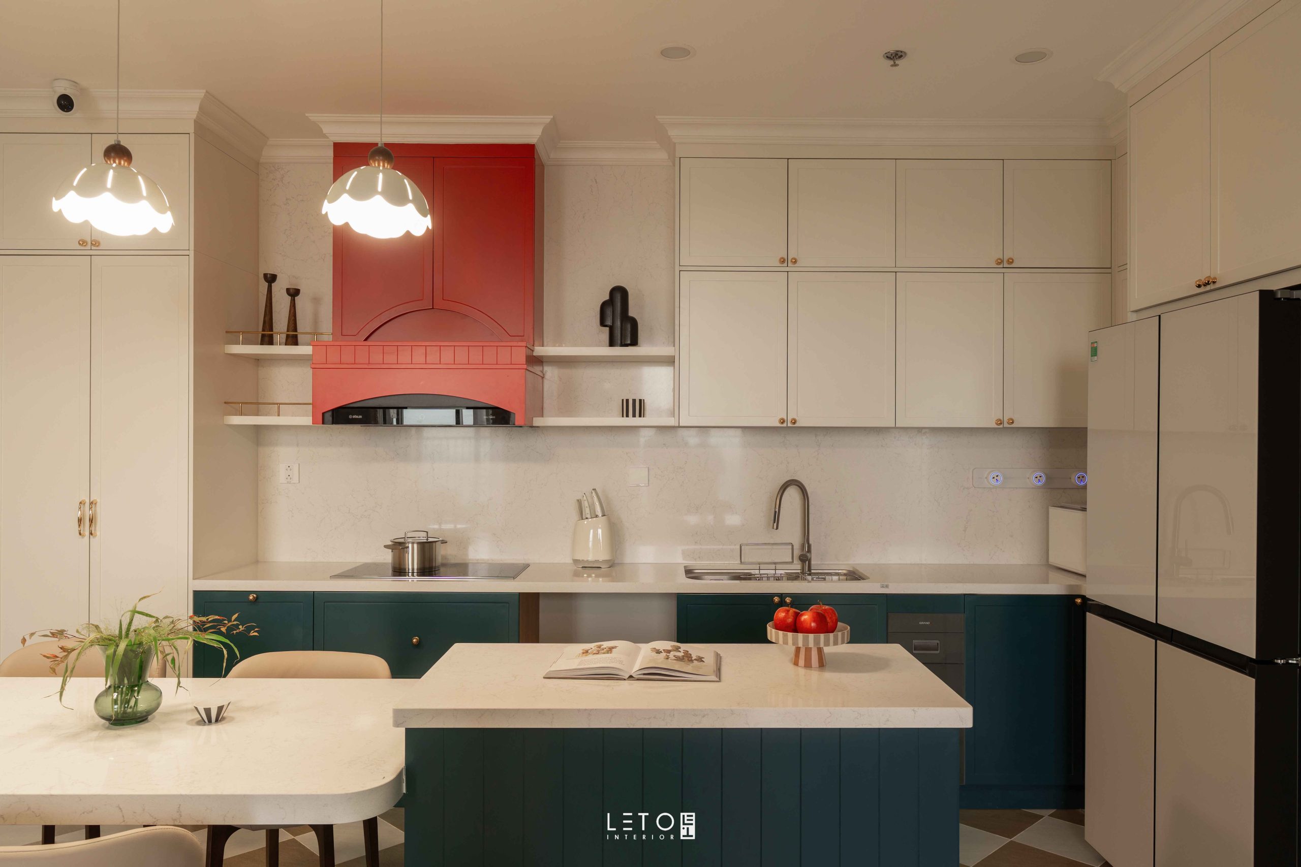 Ở khu vực bếp, hai sắc độ được đặt cạnh nhau như một phép thử thị giác có chủ ý. Vermillion tại khu vực hút mùi là đỏ châu sa pha theo tỷ lệ 6:2:2:1 giữa đỏ nguyên bản, cam, nâu đất và xanh tím than. Nhờ vậy, sắc đỏ trở nên dày, chín và mang vẻ cổ điển. Bên dưới, Patina Teal phủ lên tủ bếp và bàn đảo, được tạo từ cobalt, xanh tím than và một chút đen, mang lại chiều sâu bí ẩn.