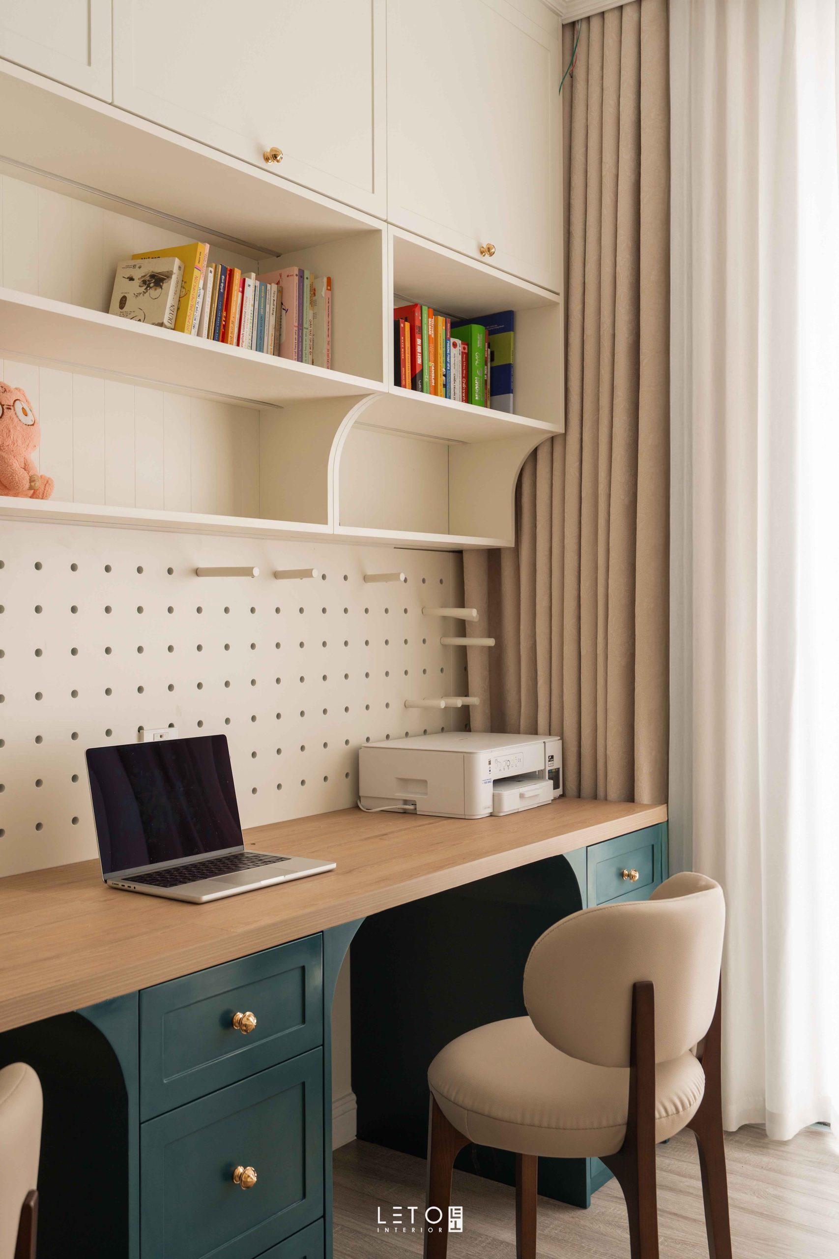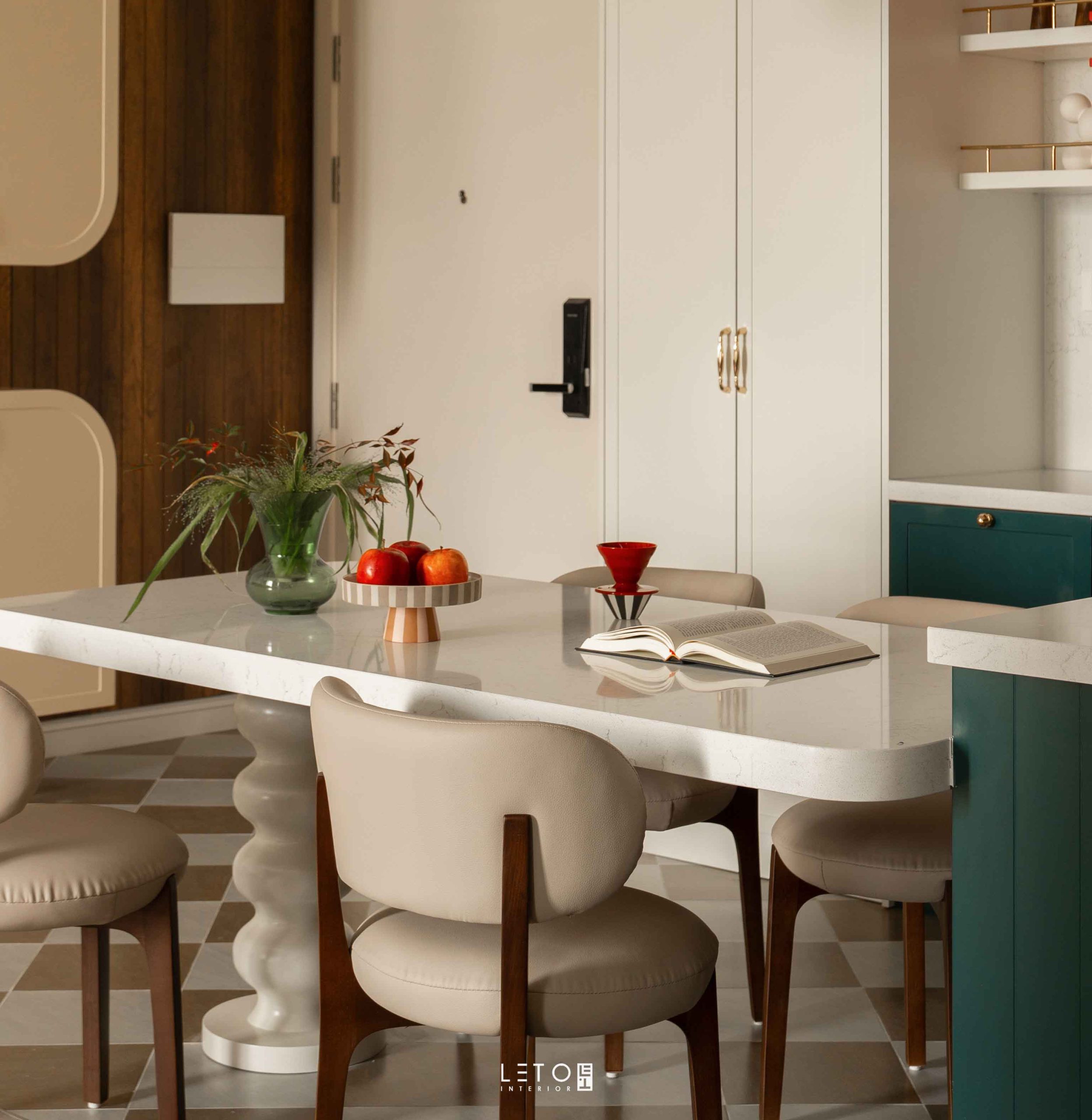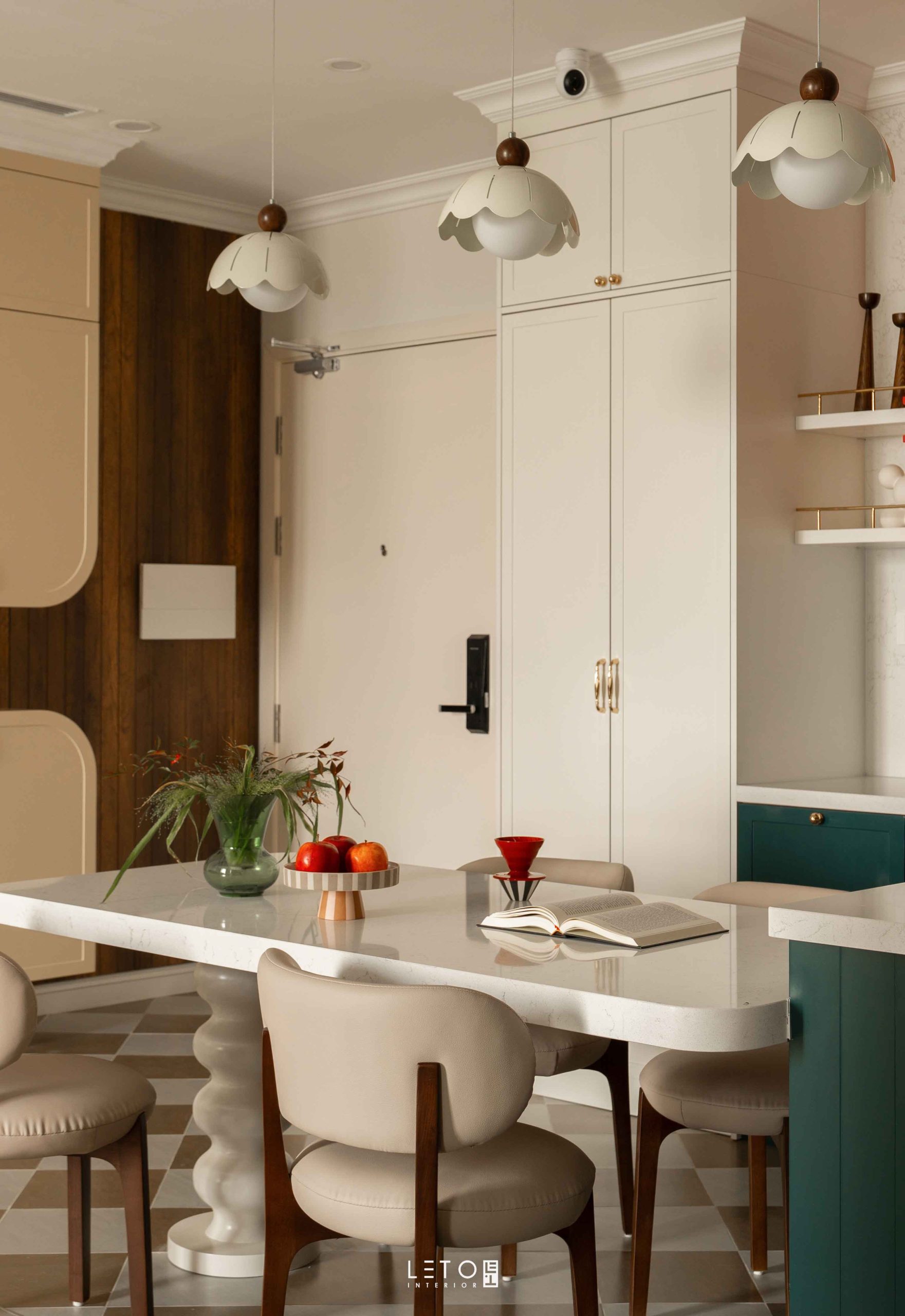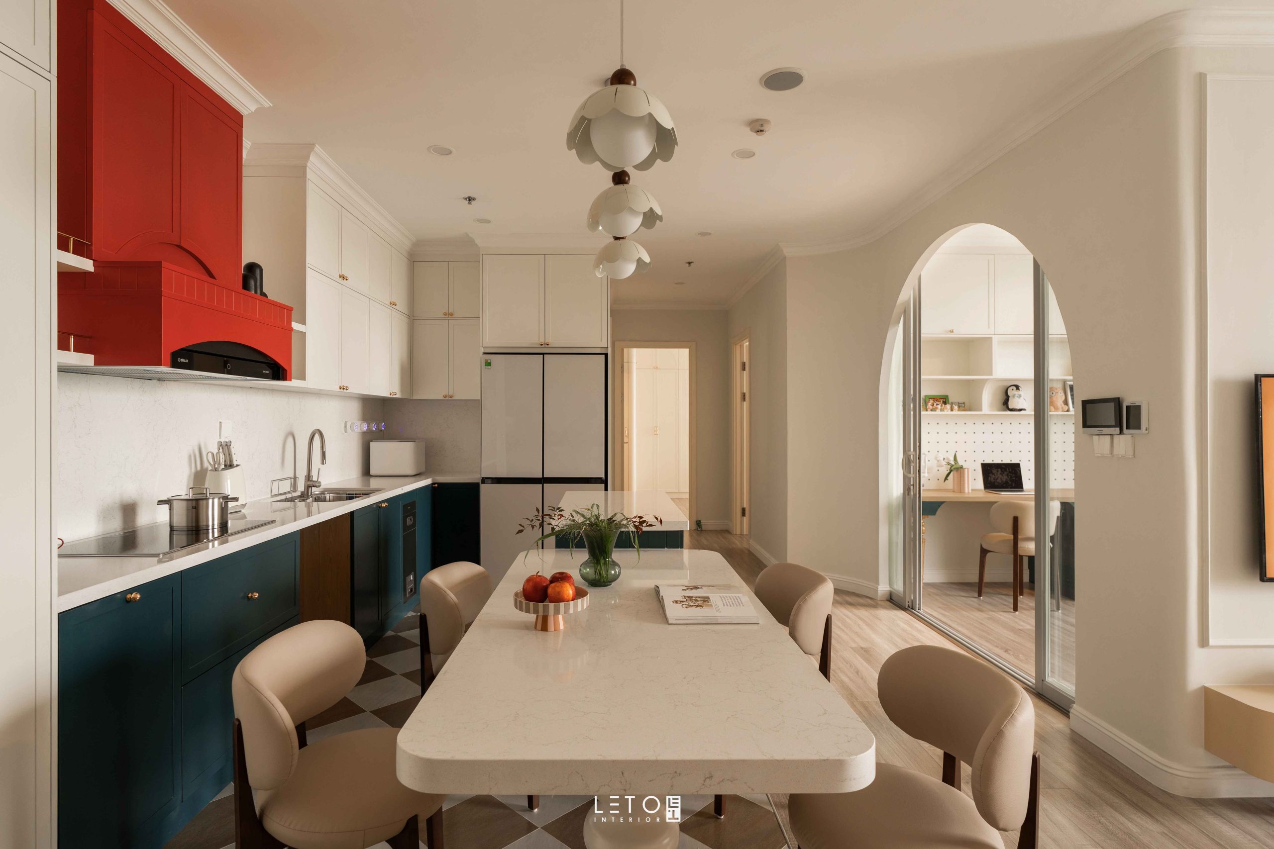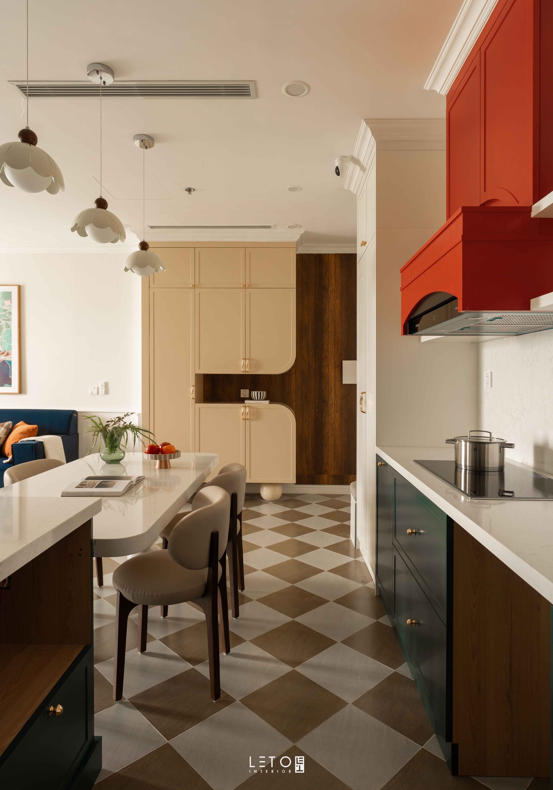 Ở khu vực bếp, hai sắc độ được đặt cạnh nhau như một phép thử thị giác có chủ ý. Vermillion tại khu vực hút mùi là đỏ châu sa pha theo tỷ lệ 6:2:2:1 giữa đỏ nguyên bản, cam, nâu đất và xanh tím than. Nhờ vậy, sắc đỏ trở nên dày, chín và mang vẻ cổ điển. Bên dưới, Patina Teal phủ lên tủ bếp và bàn đảo, được tạo từ cobalt, xanh tím than và một chút đen, mang lại chiều sâu bí ẩn.