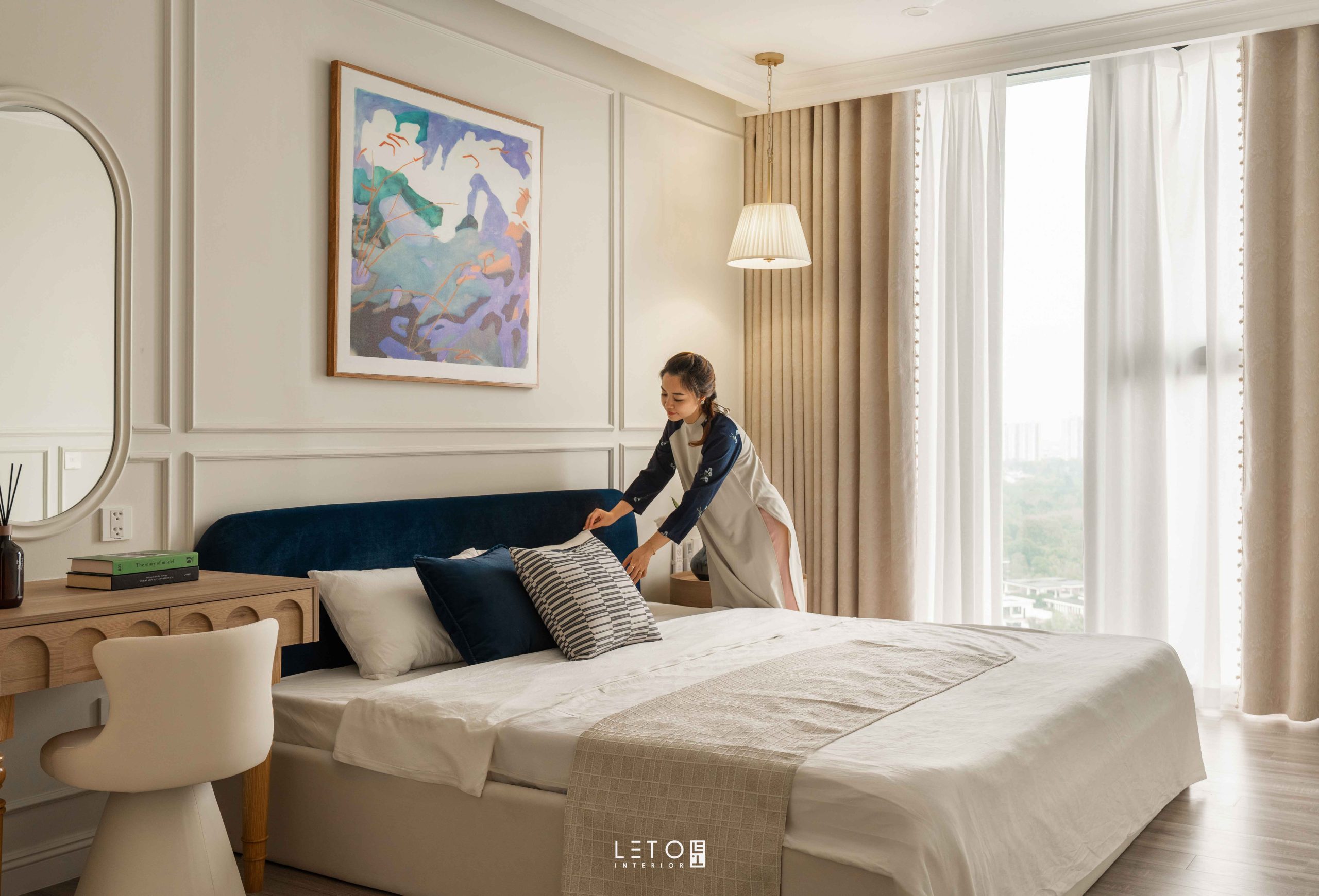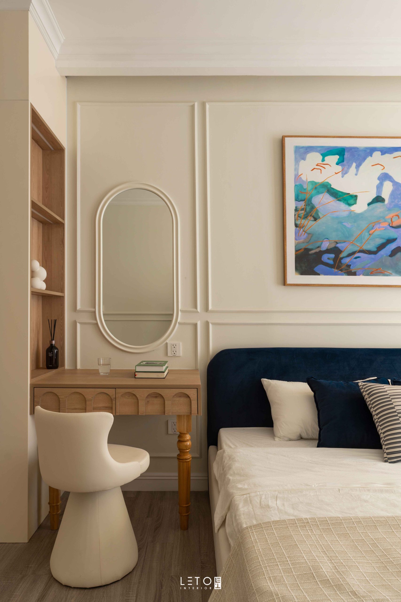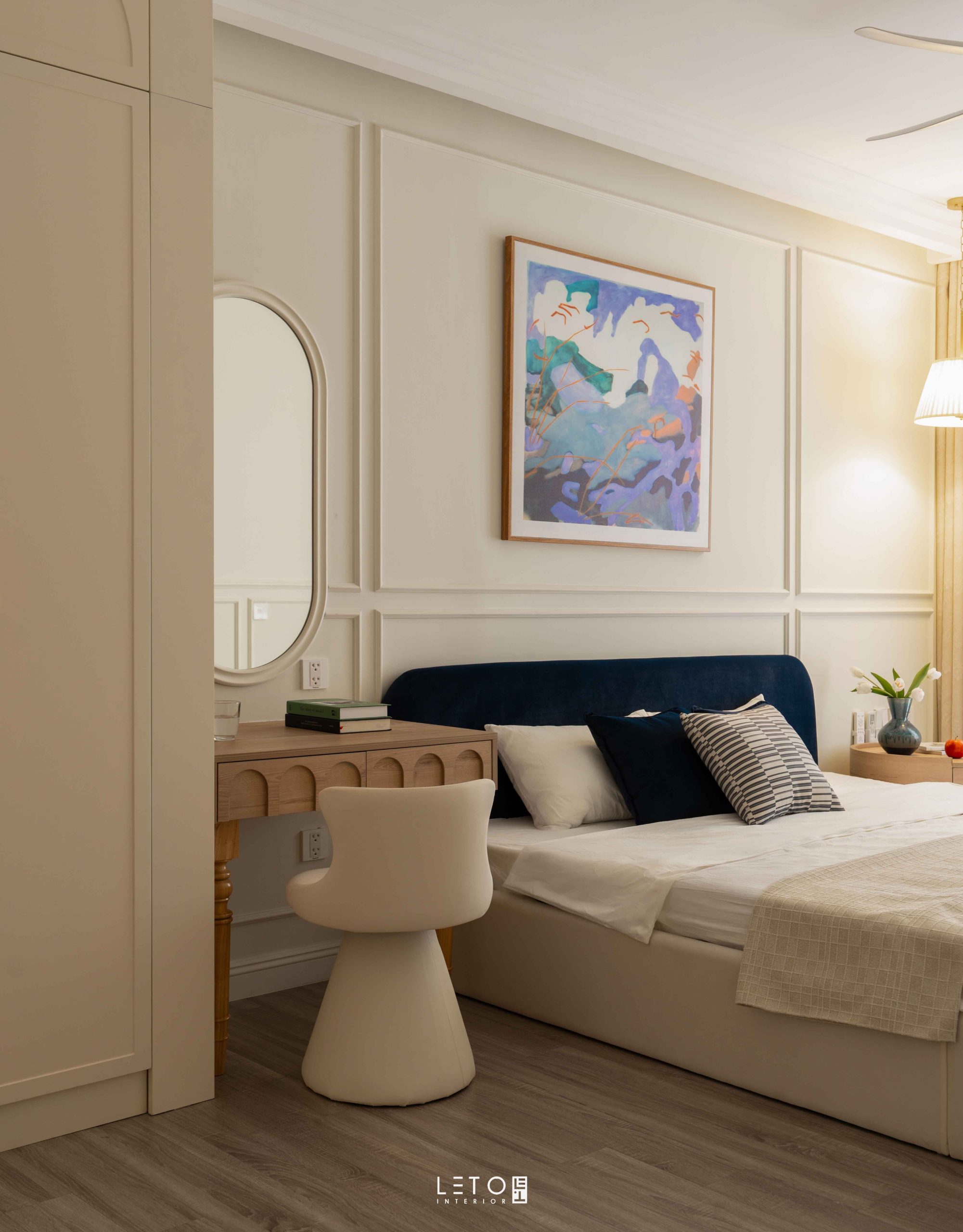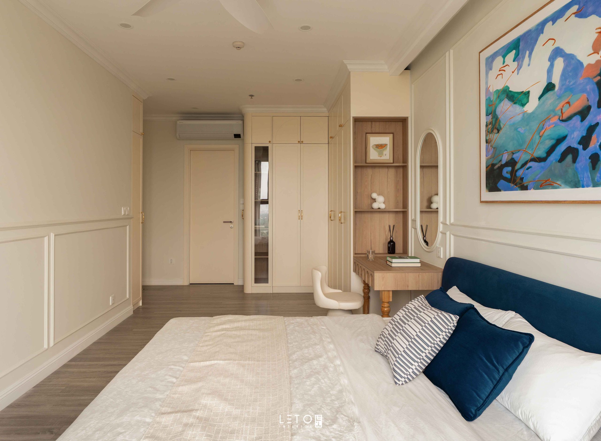 Trước tiên là sắc Lapis Lazuli ở sofa và phần bọc đầu giường. Lapis Lazuli được pha từ nền xanh dương đậm, thêm xanh lá vừa đủ, một chút đen và vài giọt đỏ lạnh. Nhờ vậy sắc xanh có chiều sâu như đá quý, vừa trầm vừa sáng, vừa tĩnh vừa cuốn hút. Tên gọi của nó vốn gắn với loại đá tượng trưng cho trí tuệ và sự vương giả, nên chỉ cần xuất hiện cũng đủ tạo nên cảm giác quyền quý và sang trọng.